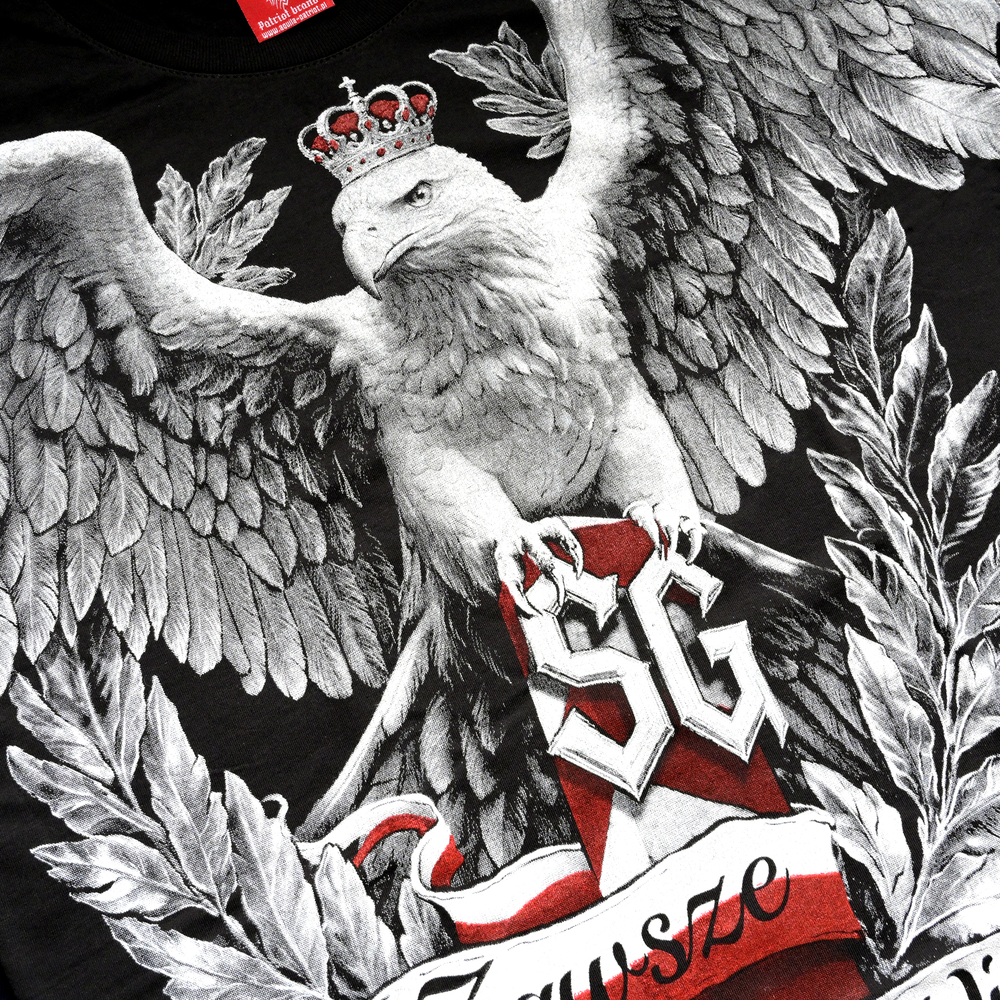 Wyjątkowa koszulka patriotyczna marki Aquila to propozycja dla mężczyzn, którzy pragną wyrazić swój szacunek do polskich tradycji. Czarny t-shirt z krótkim rękawem charakteryzuje się niezwykle szczegółowym nadrukiem, który pokrywa niemal całą przednią część ubrania. Dominującym motywem jest majestatyczny biały orzeł w koronie, rozpościerający skrzydła nad stylizowanym słupem granicznym. Na froncie widnieje dumnie brzmiące hasło Zawsze Wierni oraz skrót SG, bezpośrednio nawiązujący do formacji Straży Granicznej, co nadaje odzieży unikalnego, militarnego charakteru.