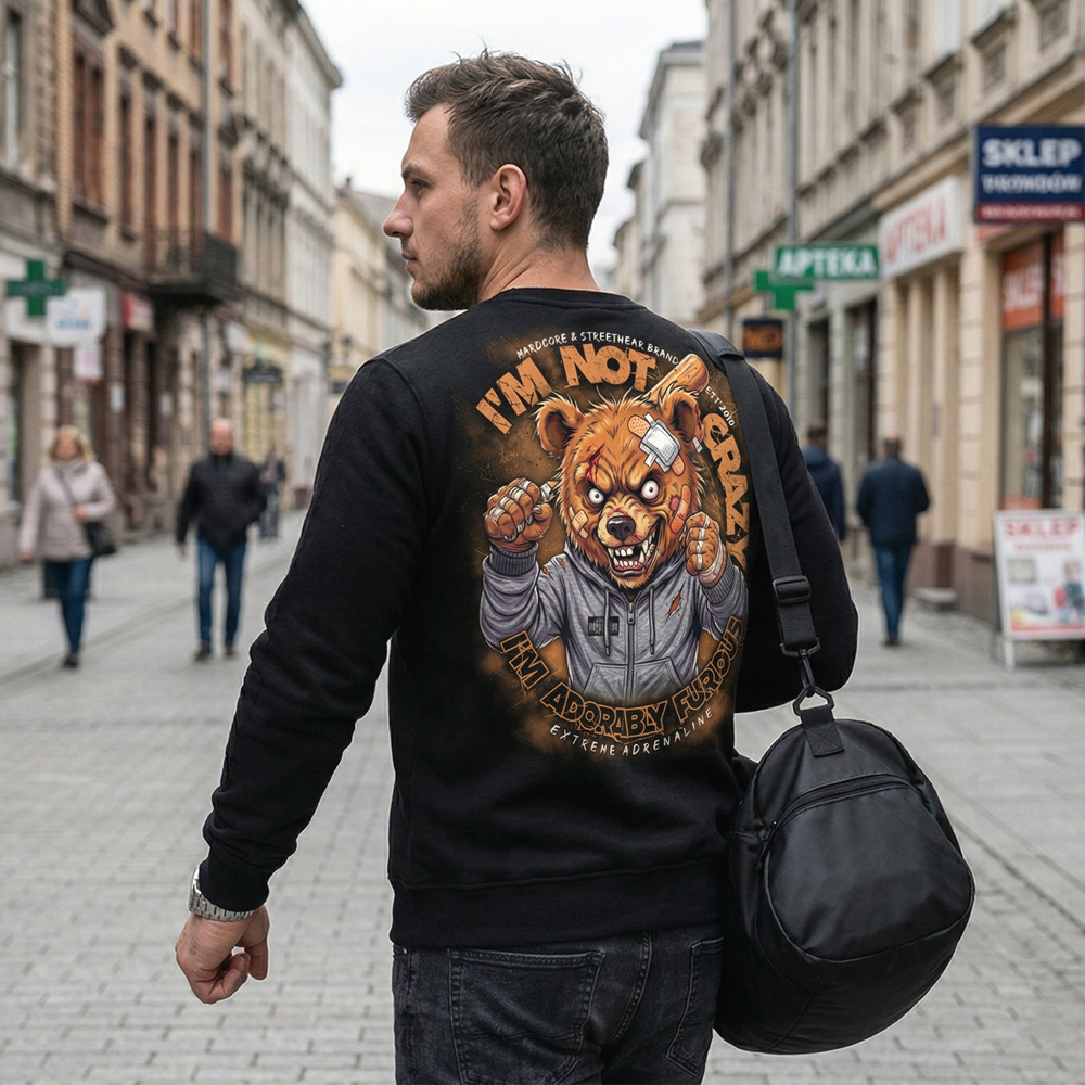 Czarna bluza męska bez kaptura typu crewneck od polskiej marki Extreme Adrenaline to idealny wybór dla osób ceniących wyrazisty styl i bezkompromisową jakość. Ten model to kwintesencja odzieży ulicznej, łączący klasyczny krój z agresywnym, nowoczesnym wzornictwem. Front bluzy zdobi unikalna, pomarańczowo-biała grafika z napisem I’m Not Crazy oraz zabawnym, a zarazem drapieżnym hasłem I’m Adorably Furious. Nadruk został wykonany z dbałością o detale, a efekt mgiełki w tle nadaje mu głębi i sprawia, że bluza wyróżnia się na tle standardowej odzieży.