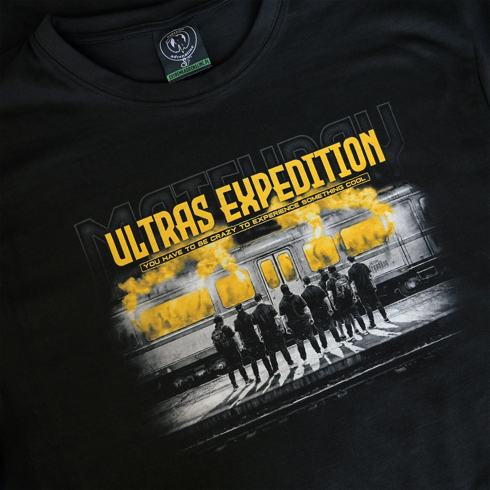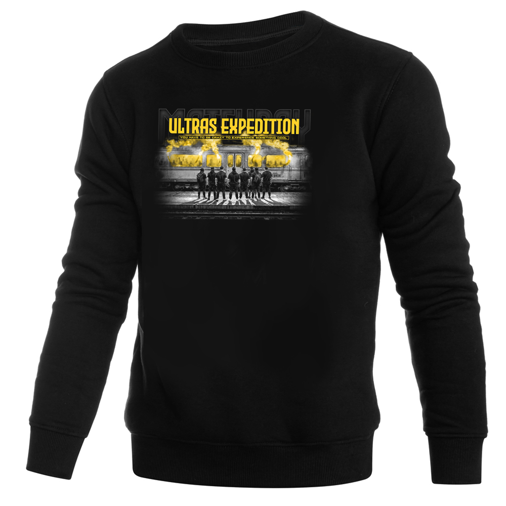 Męska bluza bez kaptura Ultras Expedition w kolorze czarnym to kwintesencja stadionowego stylu i ulicznej mody. Wykonana z wysokogatunkowej, grubej bawełny, zapewnia doskonały komfort termiczny i trwałość, dzięki czemu idealnie sprawdza się zarówno na trybunach, jak i w codziennym użytkowaniu. Centralnym punktem tej bluzy typu crewneck jest unikalny, szczegółowy nadruk na piersi, przedstawiający grupę kibiców na peronie kolejowym oraz pociąg z dymiącymi, żółtymi racami. Wyrazista grafika z hasłem „You have to be crazy to experience something cool” nadaje jej autentyczny, bezkompromisowy charakter.