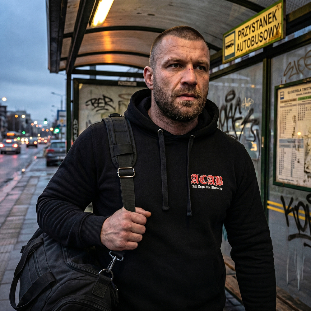 Kluczowym elementem wyróżniającym ten model jest wysokiej jakości nadruk 3D na piersi. Umieszczony na wysokości serca czerwony napis ACAB, wykonany charakterystyczną gotycką czcionką z wyraźnym białym konturem, przyciąga wzrok i nadaje bluzie bezkompromisowego charakteru. Poniżej znajduje się mniejszy, precyzyjny dopis, dopełniający kompozycję graficzną. Tył bluzy pozostaje całkowicie gładki, co podkreśla minimalizm i skupia uwagę na frontowym detalu.