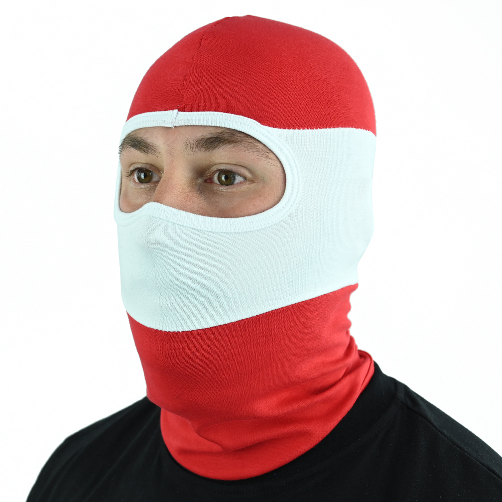 Kominiarka z wysokiej jakości dzianiny bawełnianej z dodatkiem lycry, zachowuje swój kształt, elastycznośc czy wygląd nawet po wielokrotnym użytkowaniu. Kominiarka od strony twarzy nie posiada szwa, natomiast od strony karku zszyta jest potrójnym płaskim szwem co zapewnia, że idealnie dopasowuje się do kształtu głowy. Otwór na oczy oraz dół kominiarko obszyte zostały lamówką o szerokości 1 cm.