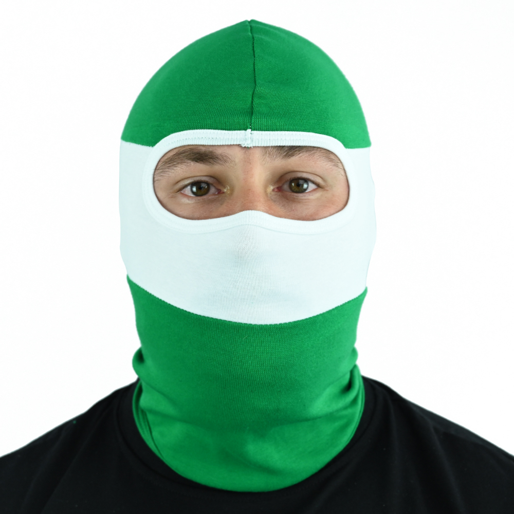 Kominiarka z wysokiej jakości dzianiny bawełnianej z dodatkiem lycry, zachowuje swój kształt, elastycznośc czy wygląd nawet po wielokrotnym użytkowaniu. Kominiarka od strony twarzy nie posiada szwa, natomiast od strony karku zszyta jest potrójnym płaskim szwem co zapewnia, że idealnie dopasowuje się do kształtu głowy. Otwór na oczy oraz dół kominiarko obszyte zostały lamówką o szerokości 1 cm.