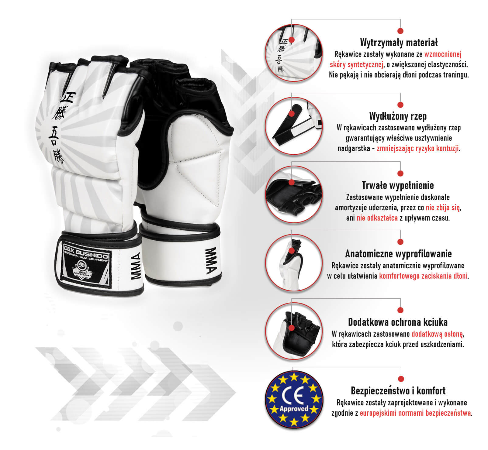 Rękawice z powodzeniem mogą być stosowane zarówno podczas treningu mieszanych sportów walki jak i podczas treningu na przyrządach (worek treningowym tarcze, gruszki refleksowe itp). Dzięki otwartej wewnętrznej stronie rękawice pozwalają zachować zdolności chwytne.