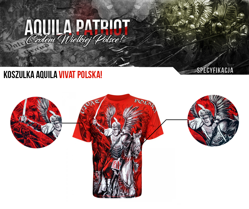 Patriotyczna koszulka wykonana przez polskiego producenta odzieży - Aquila. Podczas projektowania oraz wykonania koszulki zadbano o jej najdrobniejsze detale. Nadruk na koszulce wykonany został przy pomocy sitodruku. Jest bardzo trwały i nie ulega zniszczeniu podczas użytkowania. Produkt należy prać w temperaturze nie przekraczającej 40 stopni, pozwoli to zdecydowanie dłużej zachować trałość nadruku. Koszulka koloru czerwonego.