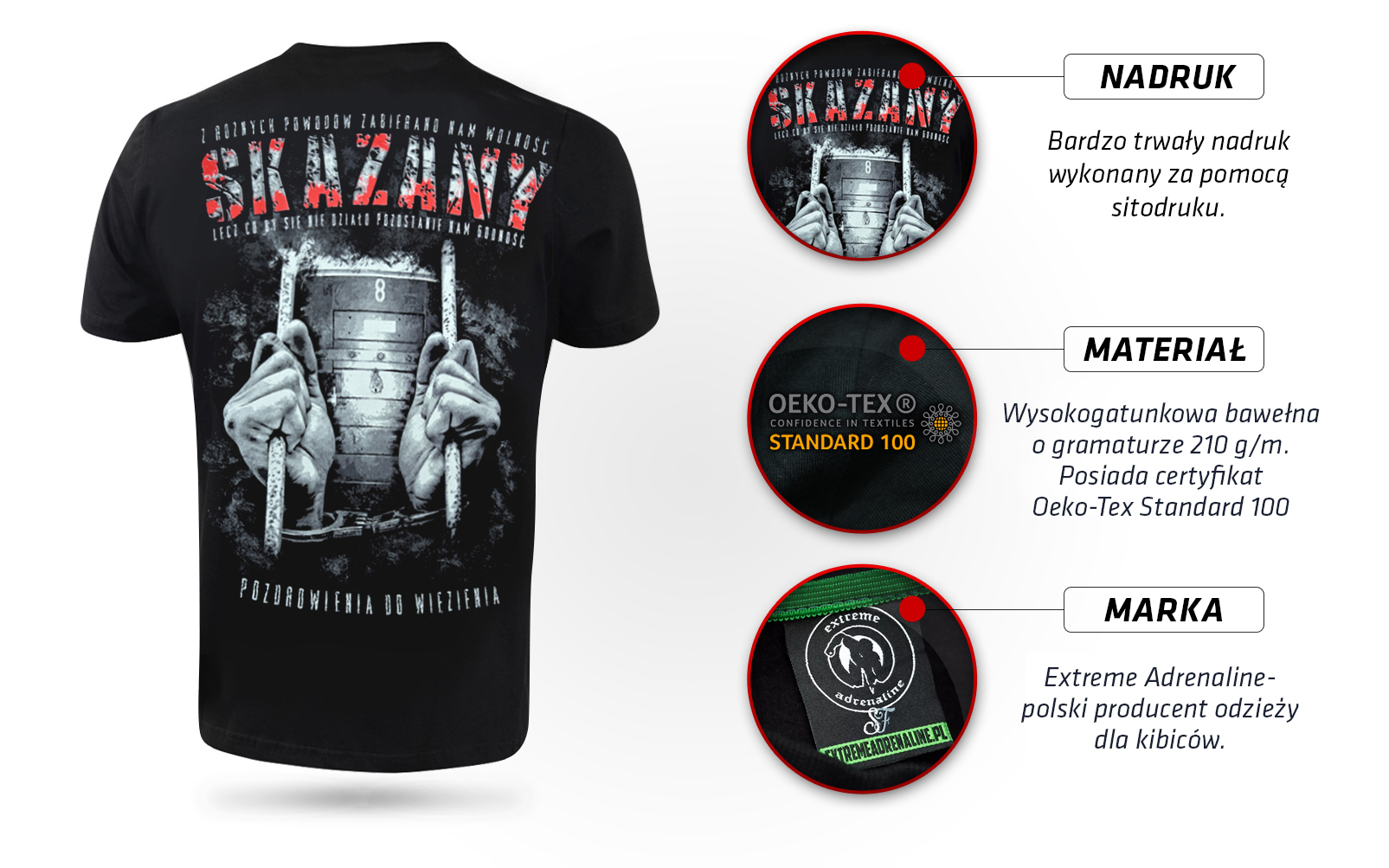 Koszulka wykonana przez polskiego producenta odzieży dla kibiców - Extreme Adrenaline. Podczas projektowania oraz wykonania koszulki zadbano o jej najdrobniejsze detale. Nadruk na koszulce wykonany został przy pomocy sitodruku. Jest bardzo trwały i nie ulega zniszczeniu podczas użytkowania. Produkt należy prać w temperaturze nie przekraczającej 40 stopni, pozwoli to zdecydowanie dłużej zachować trałość nadruku.