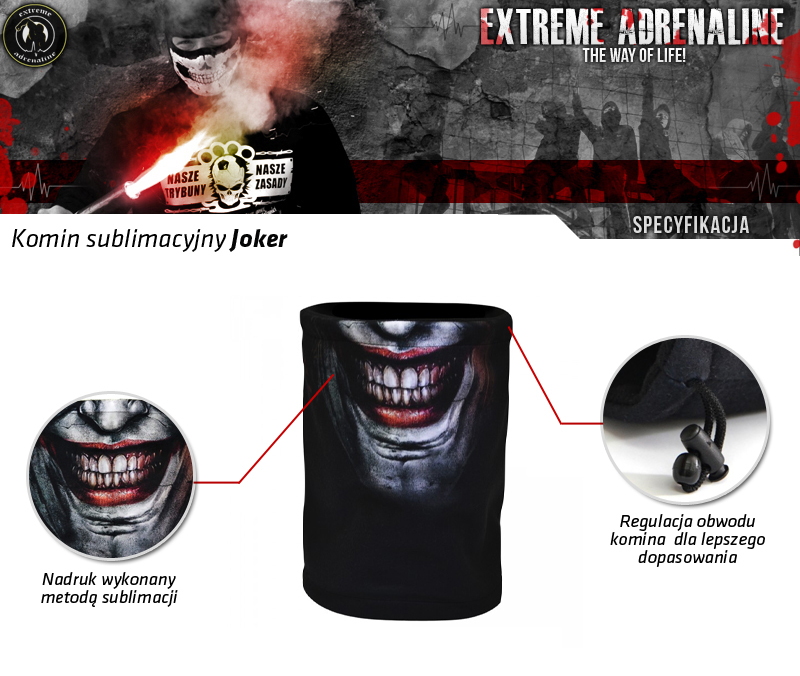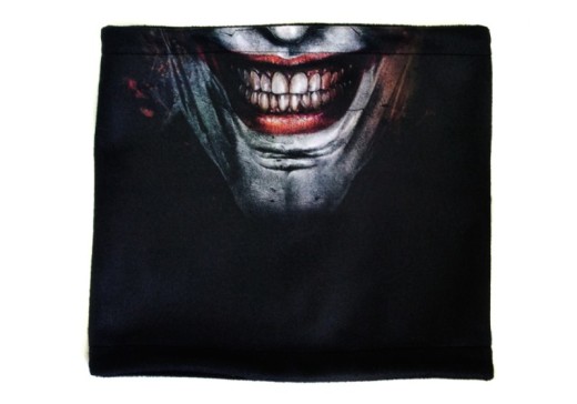 Wysokiej jakości bardzo ciepły komin polarowy marki Extreme Adrenaline z wizerunkiem twarzy Jokera. Posiada gumkę umożliwiające regulację obwodu, dzięki czemu idealnie dopasuje się do każdego użytkownika. Do wykonania komina użyto bardzo ciepłego a przy tym miłego w dotyku polaru. Idealnie sprawdzi się podczas chłodnych dni oraz mrozów, podczas uprawiania sportów zimowych oraz codziennego użytkowania. Komin może być noszony na wiele sposobów min. jako ochrona szyi lub zaciągnięty na twarz - w tym przypadku doskonale będzie chronił nasze usta oraz nos przed wiatrem. Nadruk wykonany został przy pomocy sublimacji - jest bardzo trwały i nie ulega zniszczeniu.