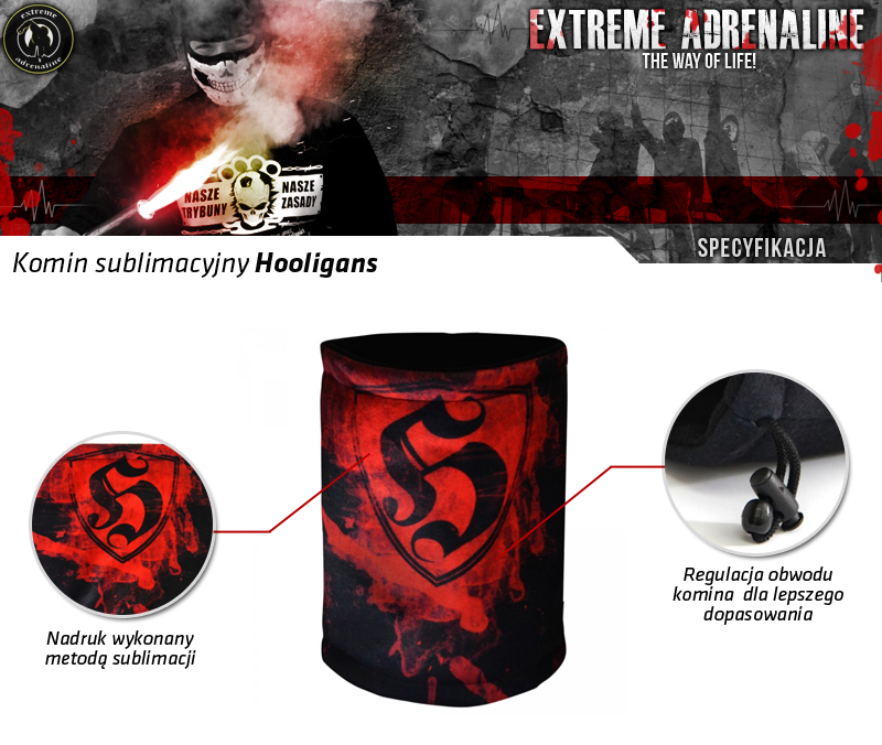 Wysokiej jakości bardzo ciepły komin polarowy marki Extreme Adrenaline z wizerunkiem znaku Hooligans. Posiada gumkę umożliwiające regulację obwodu, dzięki czemu idealnie dopasuje się do każdego użytkownika. Do wykonania komina użyto bardzo ciepłego a przy tym miłego w dotyku polaru. Idealnie sprawdzi się podczas chłodnych dni oraz mrozów, podczas uprawiania sportów zimowych oraz codziennego użytkowania. Komin może być noszony na wiele sposobów min. jako ochrona szyi lub zaciągnięty na twarz - w tym przypadku doskonale będzie chronił nasze usta oraz nos przed wiatrem. Nadruk wykonany został przy pomocy sublimacji - jest bardzo trwały i nie ulega zniszczeniu.