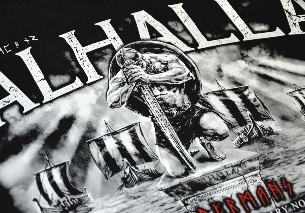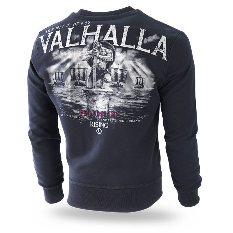 Sweatshirt in a classic cut. Slipped over the head, finished with a welt at the neck. Wide welts are also used at the bottom of the sweatshirt and at the sleeves. On the left sleeve, there is a small label with the brand logo. The model is made of high-quality cotton with a weight of 320g. Model from the Vikings line. On the back there is a printed graphics with the figure of a Viking kneeling on a pedestal. He rests his head against his sword that says Ragnarok. Battle ships follow him. Above a large word Valhalla, and below the inscription Rising and a runic sign.