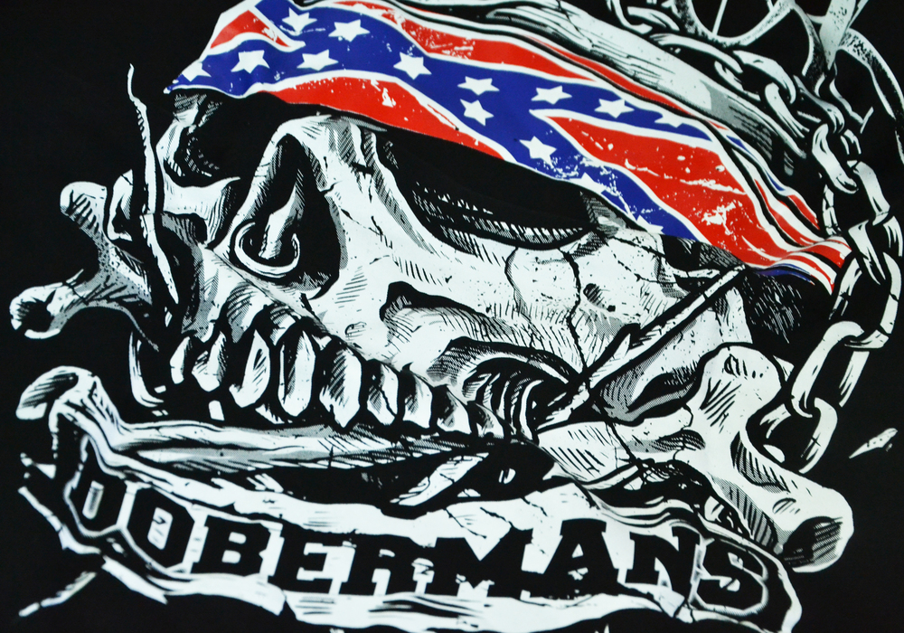 Men's cotton sweatshirt made of heavyweight knitwear (320g). Slipped-over model. Durable cuffs at the bottom, sleeves and neck. At the bottom, there is an insert with the company logo. The back of the sweatshirt is decorated with a print covering almost the entire surface of the product. In the center of the pattern, there is a large skull with a tricolor bandana and crossed bones, below a banner with the Dobermans logo. At the height of the shoulder blades, the Gothic inscription Terror, repeated on the front of the sweatshirt in a smaller size.