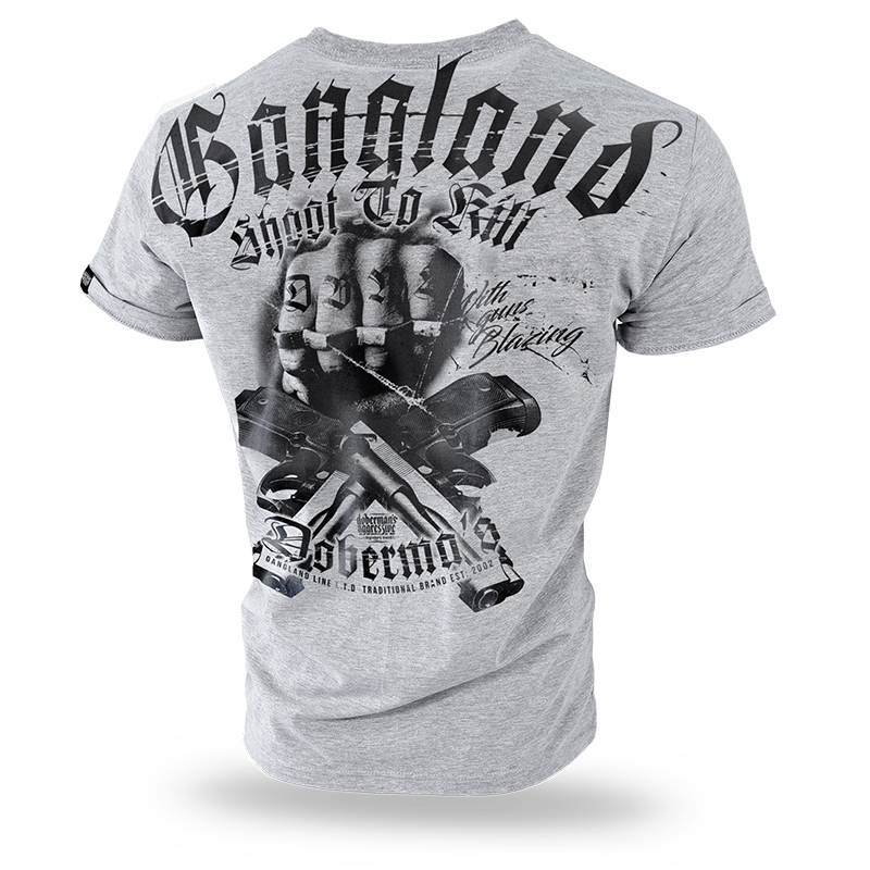 Men's t-shirt with a large print on the back. Between the arms there is an inscription Gangland and the slogan Shoot to kill. Below, a fist with brass knuckles and two crossed pistols. Several damage effects were used in the print. On the front there is a semicircular inscription with the name of the model in Gothic font. The clothes are made of high-quality 200g cotton. The shirt is finished with a narrow ribbing at the neck, which improves the comfort of use. On the left sleeve, there is a woven label with the Dobermans Aggressive logo.