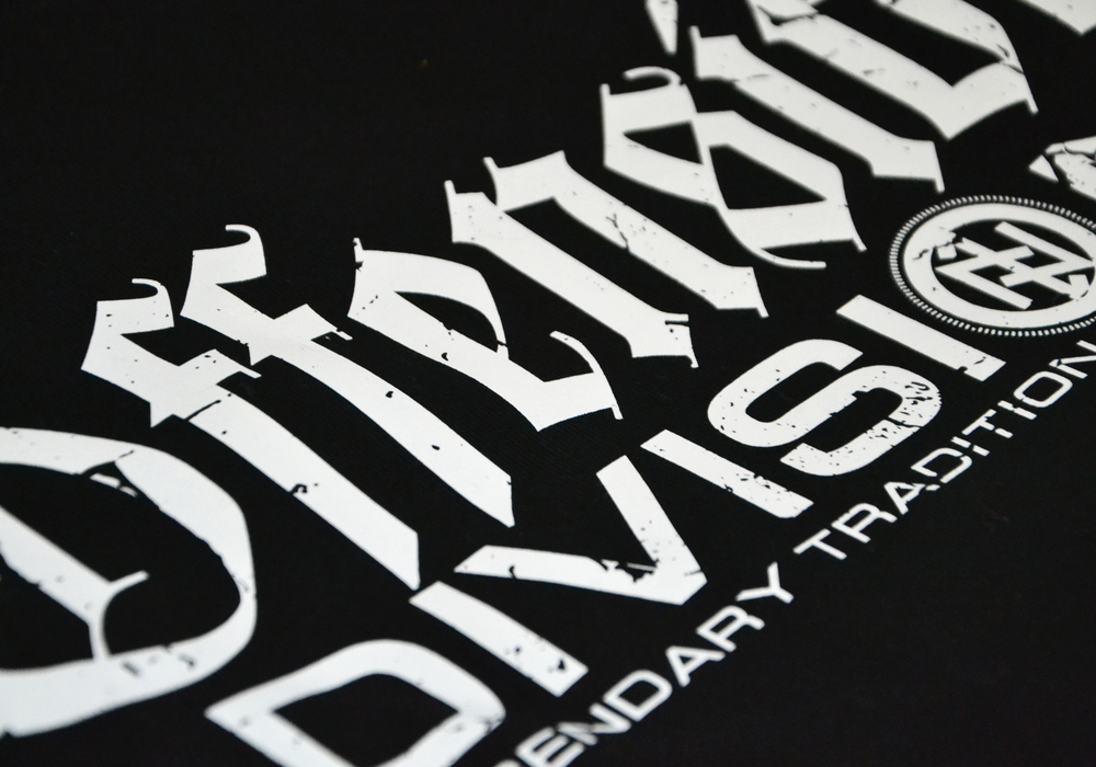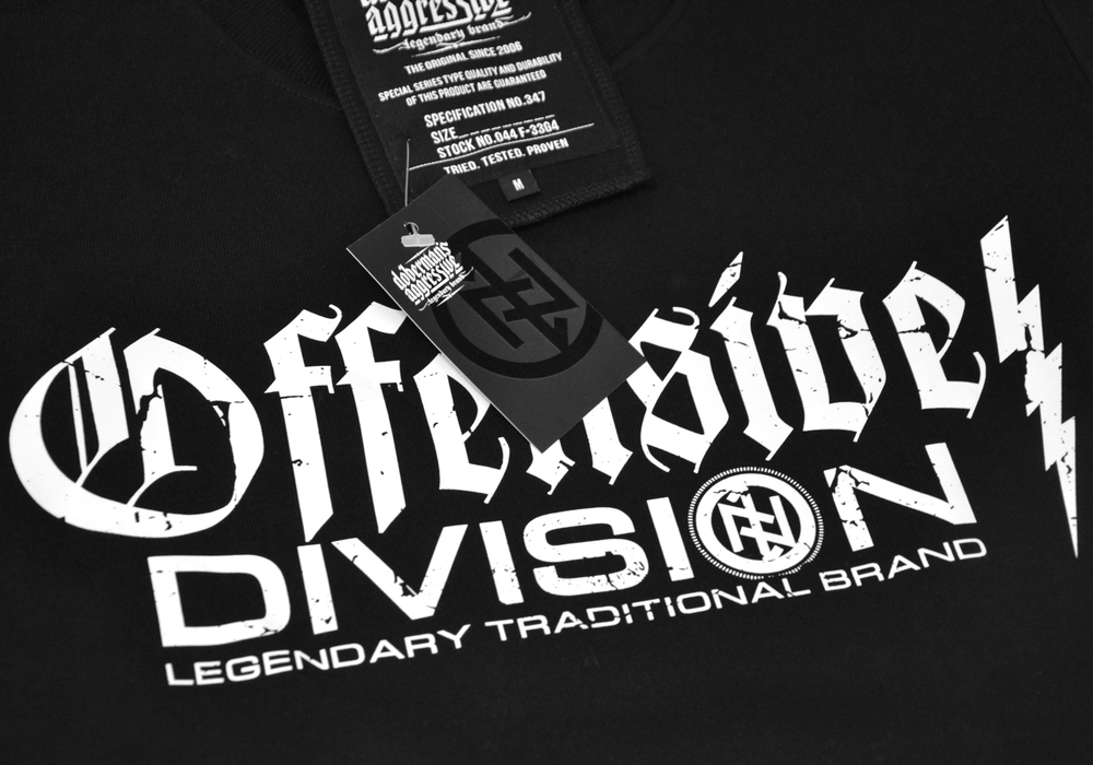 Men's sweatshirt pulled over the head. Model without pockets, with a narrow welt at the neck and a wide welt at the bottom of the sweatshirt and at the sleeves. Clothing marked with Dobermans Aggressive tags. Made of high-quality 200g cotton. Classic model of the Offensive line. There is a pattern with two inscriptions on the chest. The upper one was made with a Gothic font. The side of the pattern is closed by lightning. On the back of the neck there is a small runic mark in a circle.