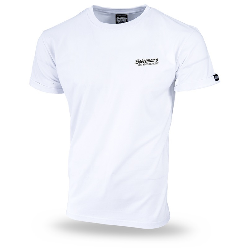 Men's printed t-shirt. Made of high-quality 200g cotton. Classic cut with short sleeves and inside pleat. A small label with the brand logo on the sleeve. The print covers almost the entire back of the T-shirt. In the center is a rabid dog prepared to attack. On the side, the inscription Dobermans and additional slogans in a Gothic font. A small inscription on the left breast.