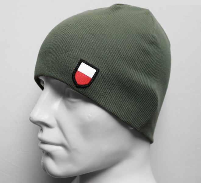 Acrylic winter hat in a fashionable khaki color, with a patch depicting a shield in white and red colors.