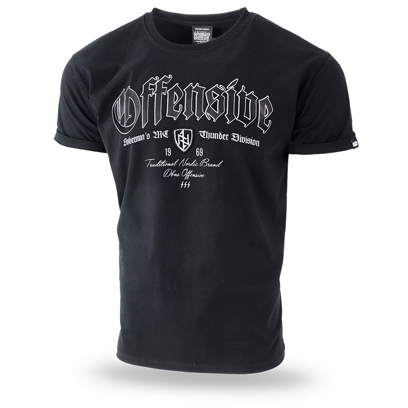 This is another model from our stable of classics that we want to present to you. High-quality cotton T-shirt from the OFFENSIVE collection. On the chest there is a large `` Offensive '' inscription in the Gothic style. Below, in the center, a patch with an embroidered shield with runes, referring to Nordic beliefs. Inscriptions in the same style on the sides. Underneath, a password and three lightning bolts. The lightning motif is repeated on the diamond plate, but embroidered, which gives the whole character its character. The T-shirt has a small logo tag on the sleeve.