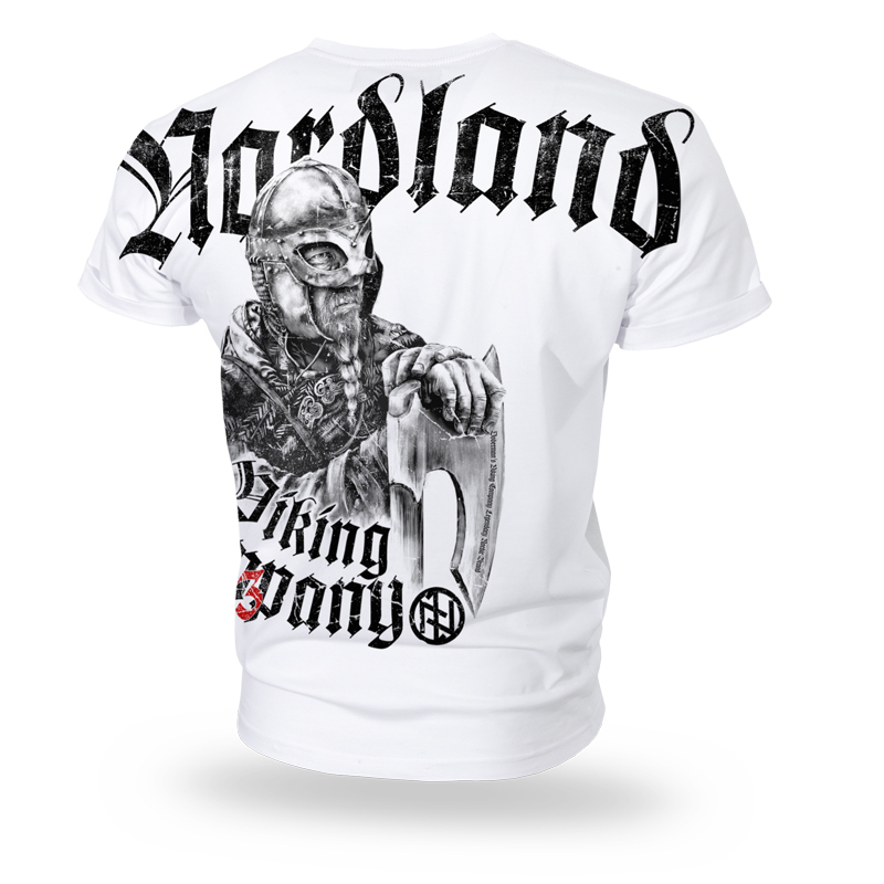 T-shirt with Scandinavian-style graphics. On the back there is a large print showing a Viking warrior with an ax. Below the inscription Viking Company in the form of an arc, a small shield with runic marks and the date 793. On the shoulder blades there is a large word Nordland, passing through both seams of the sleeves and repeated on the front of the shirt in the form of a small, vertical print along the left seam. Men's short-sleeved T-shirt, made of 100% high-grade cotton.