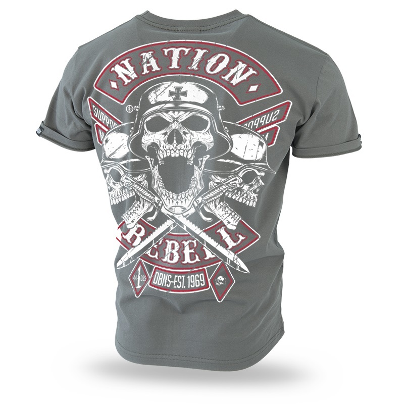 Men's 100% cotton T-shirt. On the back there is a colorful, worn-effect graphics that covers almost the entire surface of the product. In the center of the pattern there are three large skulls in helmets with Maltese crosses, below two daggers. Above and below, there are expressive banners with the gothic slogan Nation Rebell. A smaller banner with the designation DBNS-EST has been added. 1969 and two small cards. On the front there is a logo with the symbol 44. T-shirt with short sleeves and an elastic welt at the neck