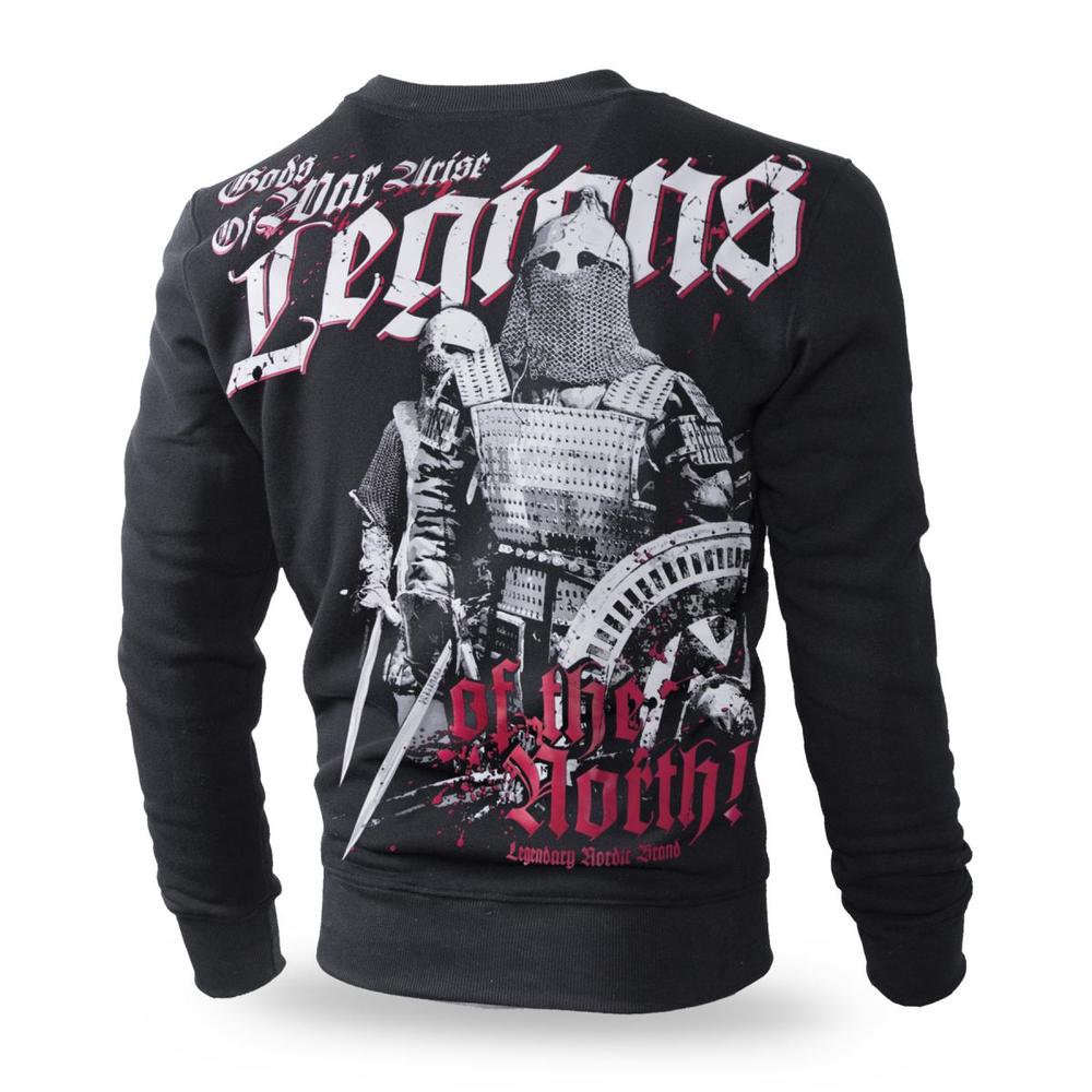Classic men's sweatshirt in a simple cut, slipped over the head. Finished with a narrow welt at the neck. Made of high-quality 320g cotton. On the left sleeve, there is a small label with the company logo. Pattern from the Viking collection. On their backs, two warriors are headed to the battlefield. Characters are armed with swords and shields. The whole thing is closed with the slogan Legions of the North. The inscription repeats on the left shoulder. Graphics in two colors.