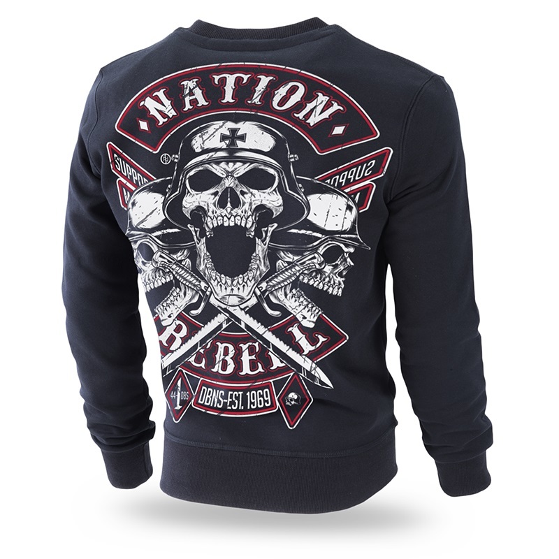 Simple men's pullover sweatshirt. Composition 100% cotton. Standard cut with welts. A reinforcement in the form of an inner pleat along the back of the neck, a black label with the Doberman's Aggressive logo at the lower welt. Model with a two-color print in a military style. On the back there is a graphic with three skulls in military helmets and crossed daggers, covering almost the entire surface of the product. Above and below there are banners with the word Nation Rebell, above the welt there is a note DBNS-EST.1969 and two cards. The front is decorated with a small logo with the number 44.