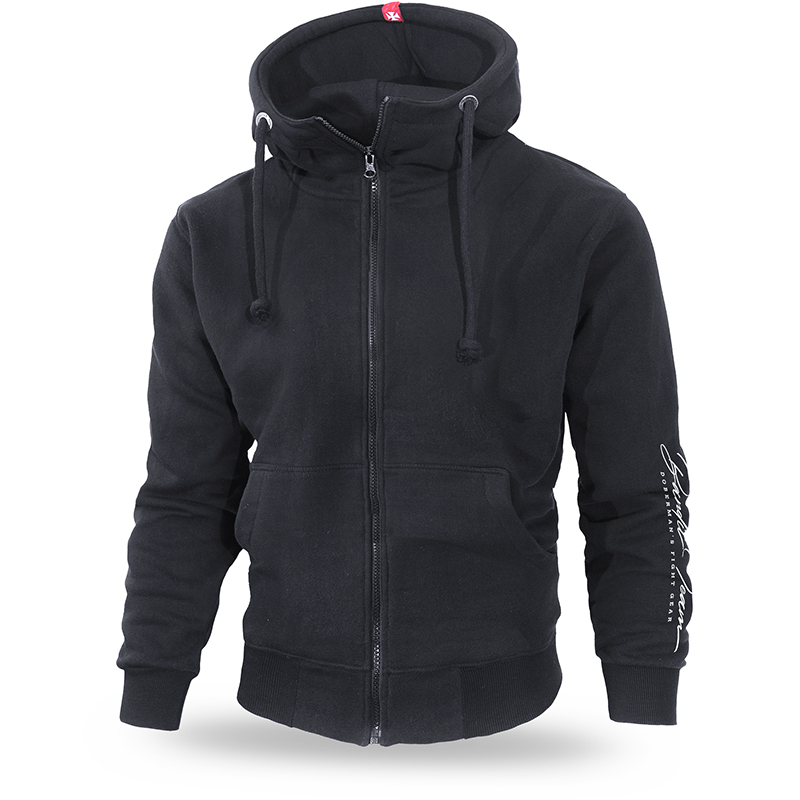 Cotton men's sweatshirt with a zipper and two patch pockets, made of a heavyweight material (320g). Practical, wide cuffs at the bottom and at the sleeves. The sweatshirt has a collar and a hood with strings and metal fittings. In the middle there is a large label with the eagle symbol. A model from a collection inspired by martial arts, decorated with a large pattern with the knuckle-duster motif and DBNS initials. In the center of the graphics there is the inscription Bandit Combat Gear of 2018. The cracked print effect and a Gothic-style font were used. A small Bandit Team Doberman's Fight Gear logo on the chest.