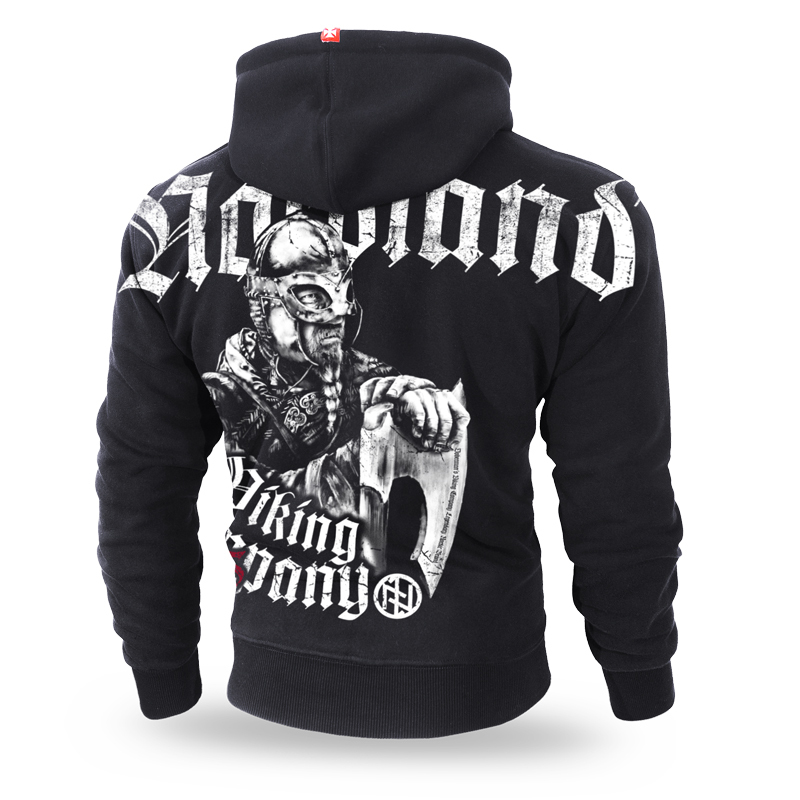 Men's sweatshirt with a zipper and a high collar by a hood. Made of 100% cotton and finished with wide cuffs. On the front, there are two patch pockets and a small, vertical Nordland print along the seam. Hood strings with metal fittings and an insert signed with the Doberman's brand. The back of the sweatshirt is decorated with graphics with a worn-effect. A pattern that covers almost the entire surface of the product, showing a Viking leaning on an ax. Below, the slogan Viking Company, a round shield with runic marks and the date 793, the words Nordland on the shoulder blades passing through the seams of the sleeves. Gothic style font used.