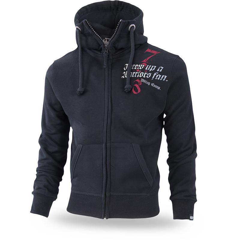 Men's sweatshirt with motifs typical of the Vikings collection. On the back there is a two-color pattern with a cracking effect, covering almost the entire surface of the product. In the center there is a graphics depicting a Viking helmet and ax, next to it the date 793 in a contrasting color, below the slogan "I grew Up A Warriors Fan". There is a large `` Bloodaxe '' inscription between the shoulder blades. Date and slogan reproduced on the front of the sweatshirt in a reduced size. Gothic style font used. Zipped men's sweatshirt with two patch pockets on the front. It has a high collar that transforms into a large hood with strings and metal fittings. The model is made of cotton knit with a weight of 320g. Two patch pockets on the front.