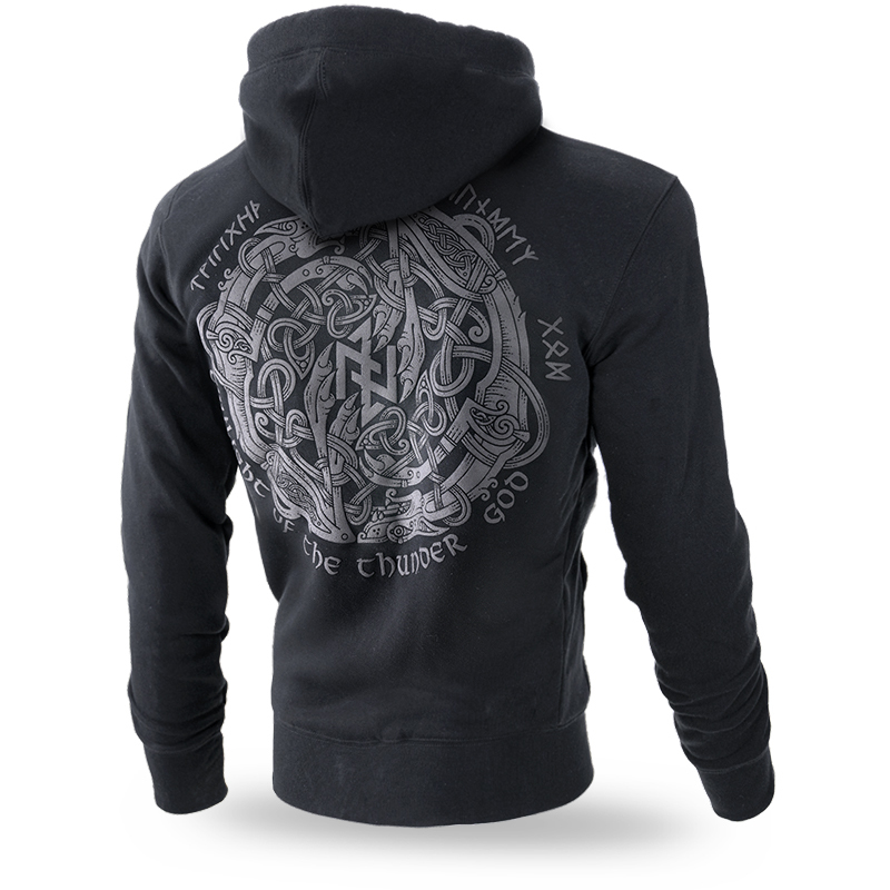 Zipped hoodie. Made of high quality cotton, it has two pockets at the front, finished with cuffs. On the left sleeve, there is a small label with the brand logo. The hood is decorated with a wide string and fittings with the brand logo. Mystical Circle is a large 3D print on the back showing a Celtic circle with a wolf and the Doberman's Aggressive logo combined in a uniform pattern. The front of the T-shirt is decorated with a runic symbol.