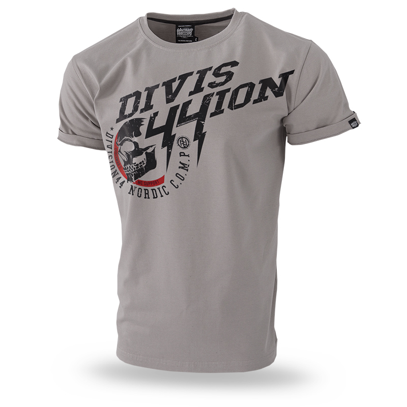 Men's t-shirt with print in a standard cut. T-shirt made of high-quality cotton with a weight of 200g. On the left sleeve, there is a small label with the Dobermans Aggressive logo. Centrally on the chest we placed the DIVISION 44 sign set at an angle. Downward fours become lightning. The character of the t-shirt is added by the skull set sideways, surrounded by a red semicircle and inscriptions. The back is plain with a small graphic on the neck.