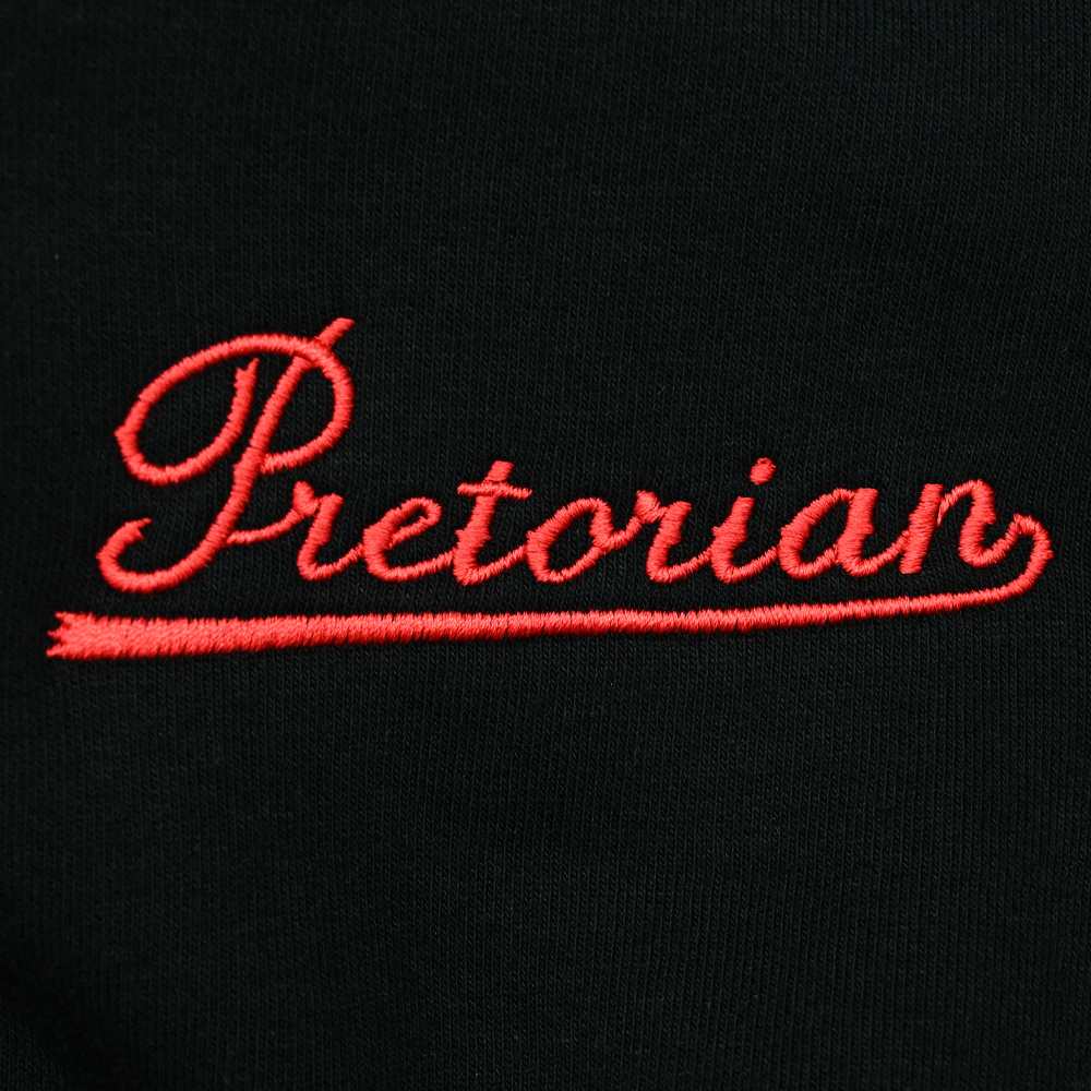 A baseball cap from the "Classic" collection by Pretorian. It is made of high-quality, thick cotton. There is a discreet print on the front of the sweatshirt and side pockets. It has a large embroidered print on the back. Pretorian clothing is characterized by the highest quality of workmanship and attention to the smallest details and details.