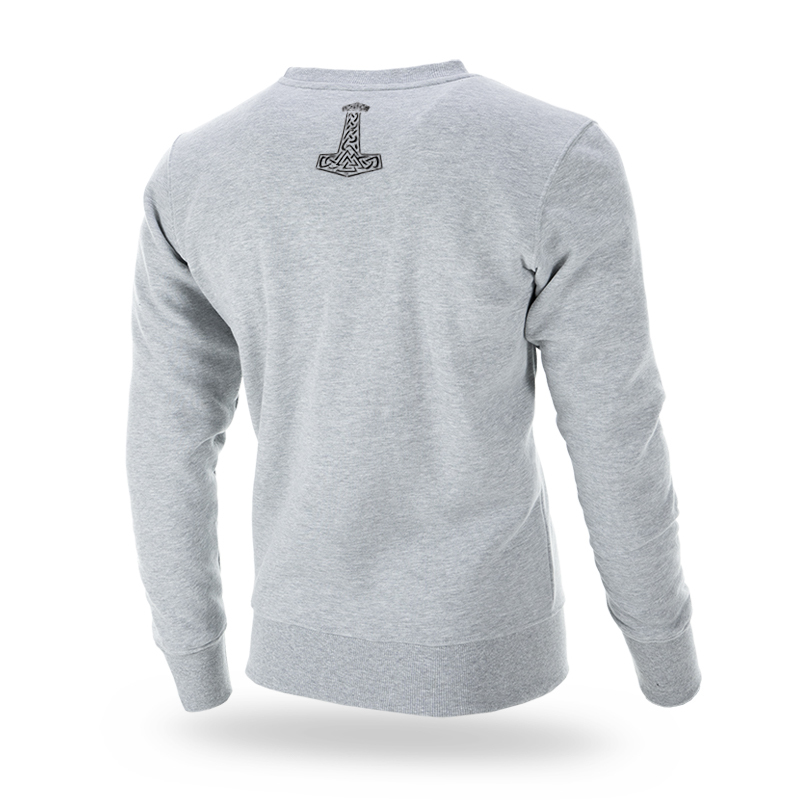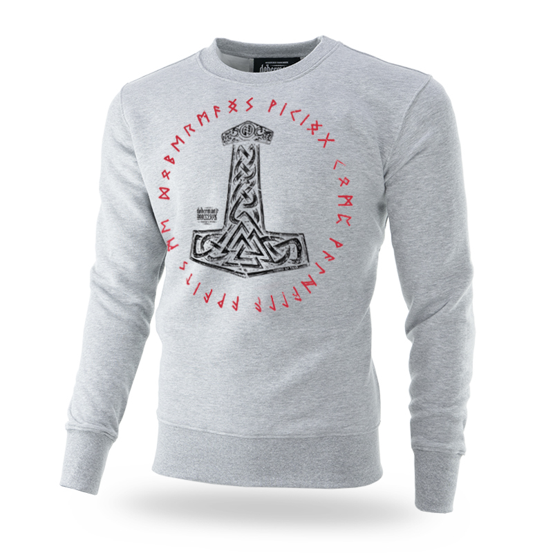 Men's classic sweatshirt worn over the head. Made of high quality cotton. The bottom of the sweatshirt and sleeves are finished with a wide welt. Left sleeve with a small Doberman's Aggressive label sewn on. On the front there is a graphic depicting Thor's hammer and the brand logo. There are red runic symbols around the graphics. On the back of the neck, a miniature graphic of Thor's hammer.