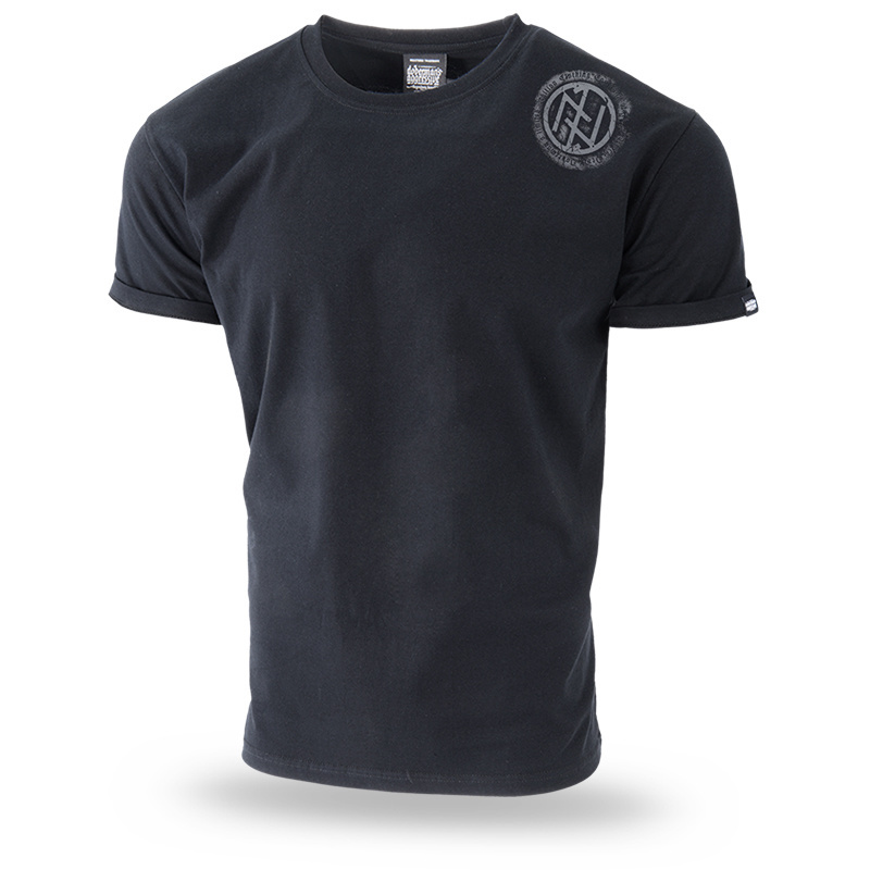 On the left shoulder there is a single-color print in the form of a circle with runic symbols. Three-color graphics with a cracked effect on the back. A pattern with a Doberman motif and two texts in Gothic font: Doberman's and Black Devil. The upper inscription runs through the sleeve seams.