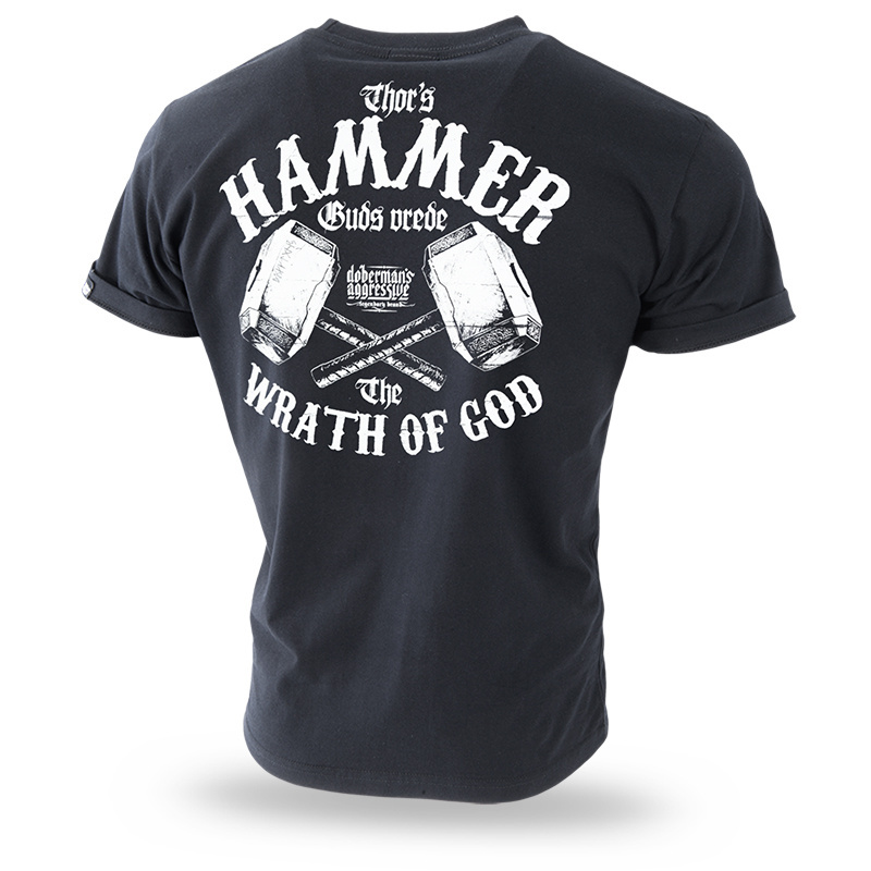 On the back of the T-shirt there is an print depicting THOR's crossed hammers, the inscription HAMMER WRATH OF GOD and a smaller DOBERMAN'S brand logo. On the left chest there is a reproduction of the print on the back in a smaller format.