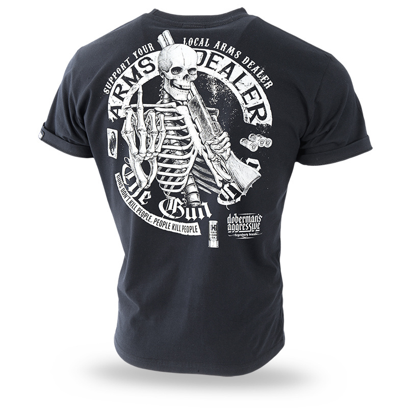 There is a small label with the brand's logo sewn on the left sleeve. On the back of the T-shirt there is a large graphic depicting a skeleton of a man with a gun and the inscription "Support your local arms dealer" on the front - a copy of the graphic in a smaller format.