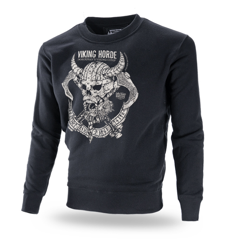Classic cotton sweatshirt, worn over the head. The bottom of the sweatshirt and sleeves are finished with a wide cuff. Clothing made of high-quality cotton, a small label with the Doberman's Aggressive brand logo on the left sleeve. On the front there is a graphic depicting a Viking skull in a helmet and two axes with Nordic decorations.