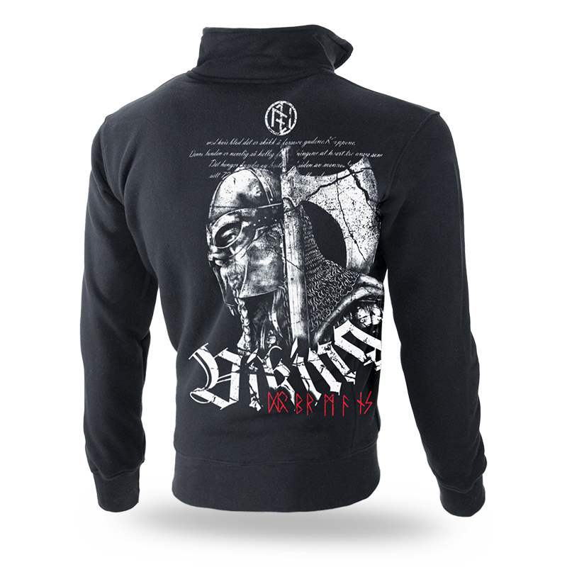 Men's sweatshirt with a zipper and two pockets. A classic model fastened high to the neck and finished with wide cuffs. Sweatshirt made of 320g cotton. Inside there is a red trim and a large colorful label with an eagle symbol. The left shoulder is decorated with a single-color embroidery with the name of the collection, made directly on the fabric. On the back there is a graphic with a Viking motif with an ax and runic symbols. The print covers almost the entire surface of the back. At the neck level there is a round embroidered patch with a runic sign.