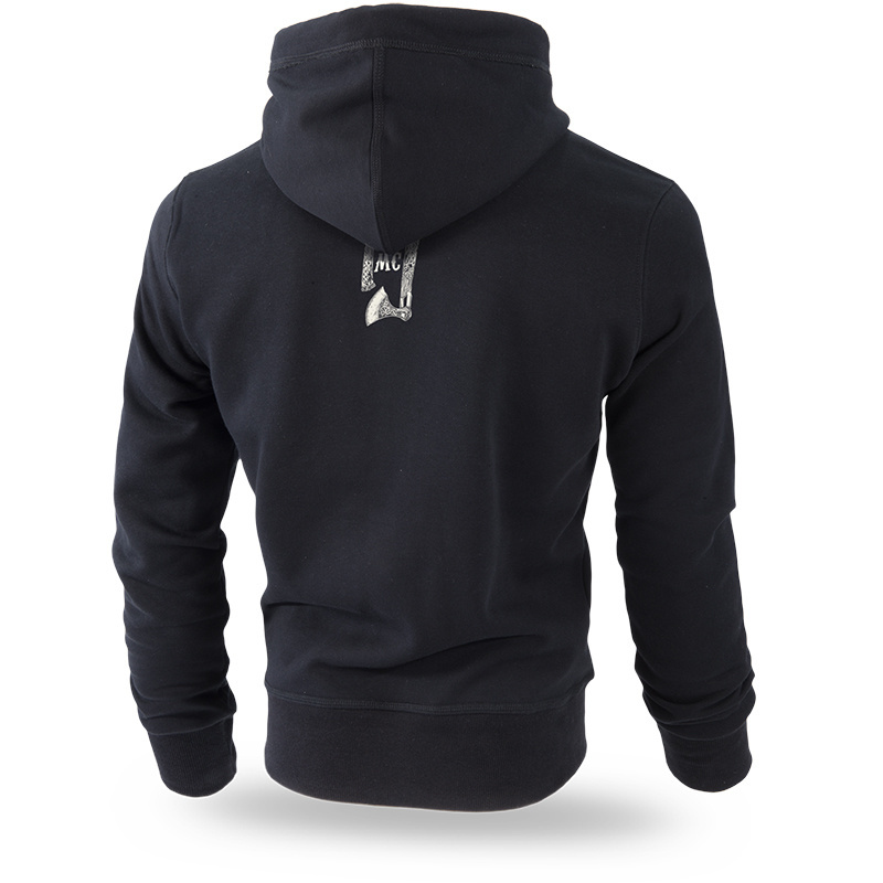 Comfortable sweatshirt with a large pocket on the front. Made of high-quality cotton weighing 320g. The spacious hood with fittings can be adjusted with strings. A large label with the company logo is sewn inside. Three Viking skulls printed on the chest refer to Nordic mythology. One of them has a runic sign on her forehead. The whole thing is finished with two banners with the slogans Viking Horde and Brotherhood. There is a smaller print with two axes on the back. Model from the Vikings collection.