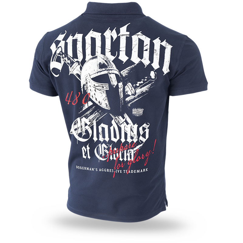 Short-sleeved T-shirt, polo style. It has a collar fastened with three buttons. The clothing is made of high-quality cotton weighing 200g. Sleeves finished with narrow cuffs. There is a small inscription Gladius of Glory on the left chest. On the back of the T-shirt there is an print depicting crossed swords and a helmet. The entire graphic ends with the inscription "SPARTAN GLADIUS OF GLORIA"