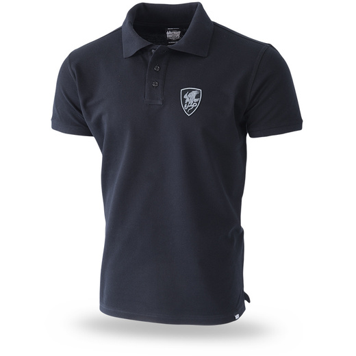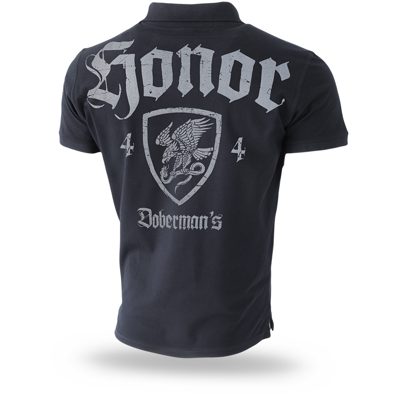 Short-sleeved T-shirt, polo style. It has a collar fastened with three buttons. The clothing is made of high-quality 200g cotton . Sleeves finished with narrow cuffs. There is a 3D print on the back. The inscription "HONOR" below is the symbol of an eagle catching a snake in its claws and the inscription "DOBERMA'S" . On the left chest there is an embroidered emblem depicting an eagle and a snake.