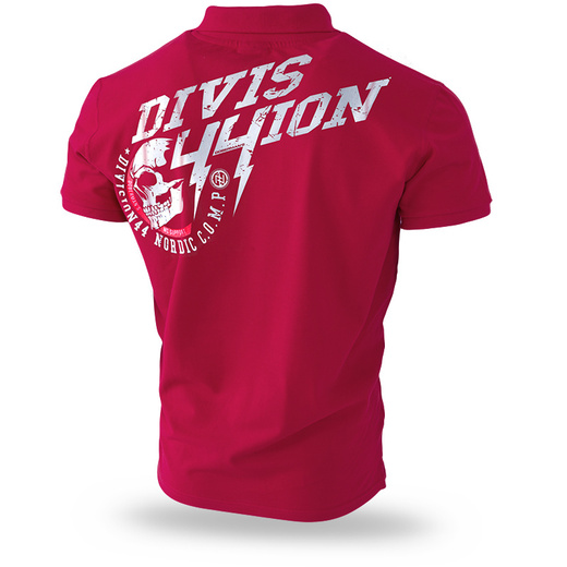 High-quality cotton polo shirt, fastened with 3 buttons at the neck and with cuffs on the sleeves. The material is 100% cotton, 200g. The left chest is decorated with two fours that turn into lightning bolts and a sideways skull, surrounded by inscriptions, which gives the shirt character. On the back there is a large inscription DIVISION 44 set at an angle and a skull surrounded by a red semicircle and inscriptions.