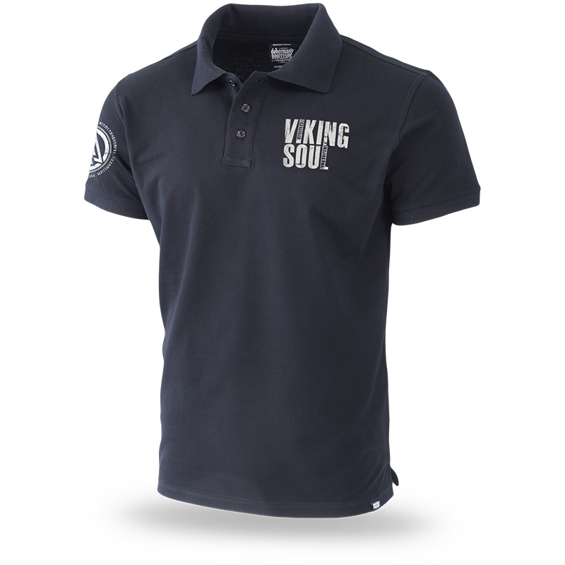 Men's polo shirt. It is made of high-quality cotton. It has short sleeves and a collar fastened with three buttons. Model from the Vikings collection. A tag with the Dobermans Aggressive logo is sewn inside. The print was made on several elements. The right sleeve was decorated with runic symbols inscribed in a circle. There is a small model name on the left chest. The back is covered with a large print with the word Viking Soul with visible Nordic motifs. All prints were made using a distressed effect.