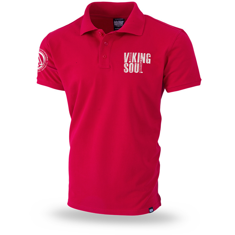 Men's polo shirt. It is made of high-quality cotton. It has short sleeves and a three-button collar. Model from the Vikings collection. Inside there is a sewn-in label with the Dobermans Aggressive logo. The print is made on several elements. The right sleeve is decorated with runic symbols inscribed in a circle. There is a small model name on the left chest. The back is covered with a large print with the inscription Viking Soul with visible Nordic motifs. All prints are made using a distressed effect.