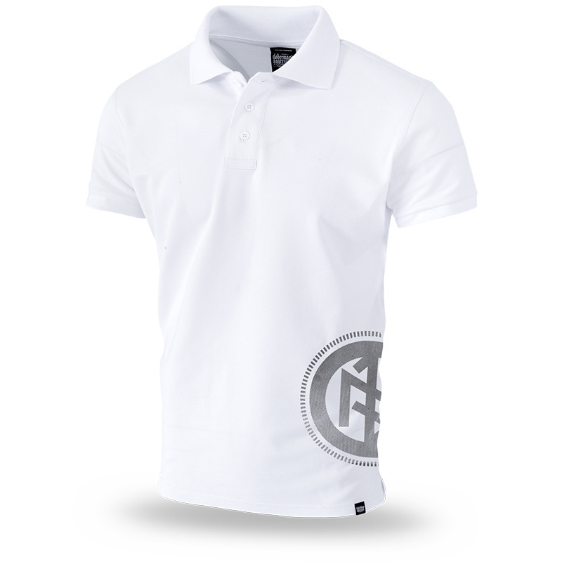 Stylish polo shirt for men. It has a three-button collar and short sleeves finished with a narrow cuff. The model is made of 200g heavyweight cotton. A runic sign is printed on the front of the shirt. A label with the Dobermans Aggressive logo is sewn in just below it. On the back there is a large graphic with the inscriptions Ruthless&Savage and two skulls. In the background a runic sign inscribed in a circle.