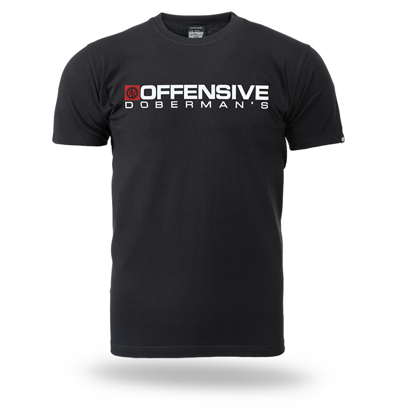 Men's T-shirt with short sleeves in a classic cut. Clothing made of 200g cotton. On the left sleeve there is a small label with the Doberman's Aggressive logo. On the front of the T-shirt there is a simple inscription OFFENSIVE with the note DOBERMANS below it. The whole design is complemented by a Nordic symbol inscribed in the shape of a square.