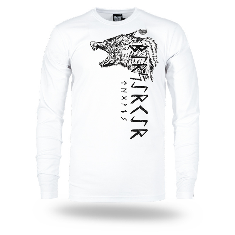 Classic men's long-sleeved T-shirt with elastic band at the neck. Made of high-gram cotton. Small label with brand logo sewn on the left sleeve. Graphic of a wolf's head with an open mouth on the front of the T-shirt. The whole is complemented by the inscription BERSERKER made along the T-shirt, and a small brand logo.