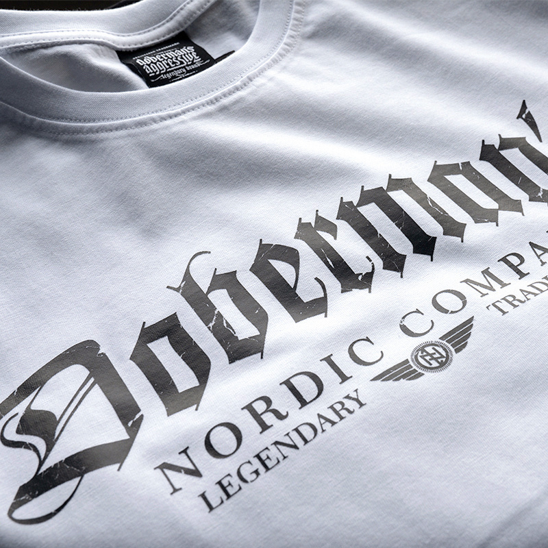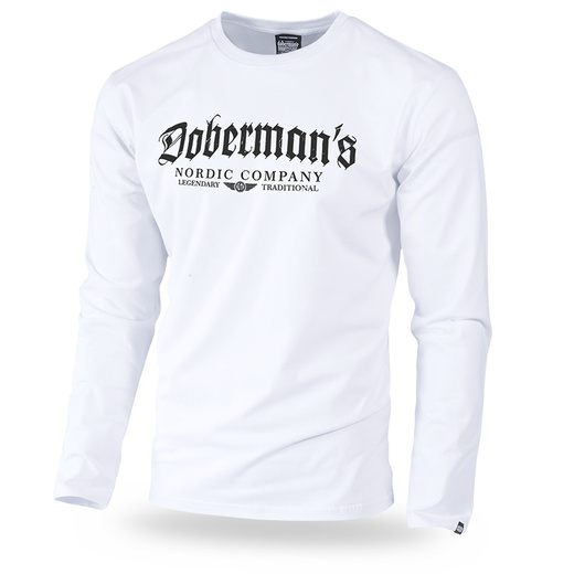 Classic men's long-sleeved T-shirt with elastic band at the neck. Made of heavyweight cotton. A small label with the brand logo is sewn on the left sleeve. On the front of the T-shirt there is a large inscription Dobermans made in Gothic font. The design is complemented by additional text below, and Nordic symbols.