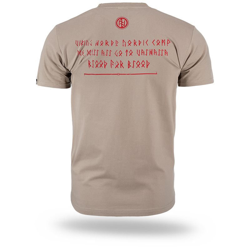 Men's T-shirt with short sleeves in a classic cut. Clothing made of 200g cotton. On the left sleeve there is a small label with the Doberman's Aggressive logo. On the front of the T-shirt there is a graphic of attacking Vikings with the inscription VIKING HORDE. On the back there is additional text made in runic symbolism.