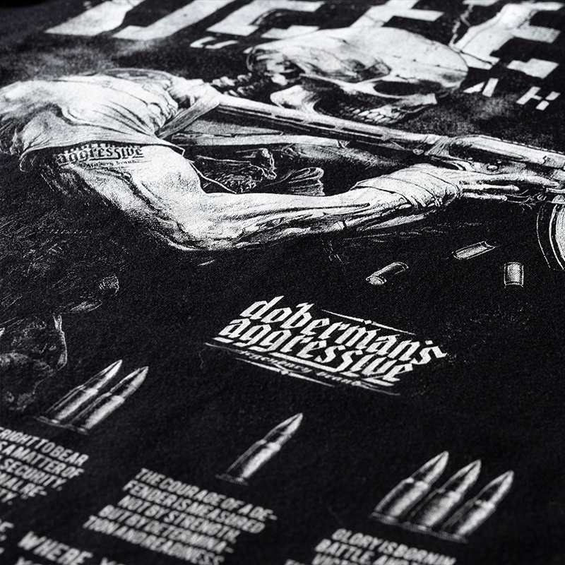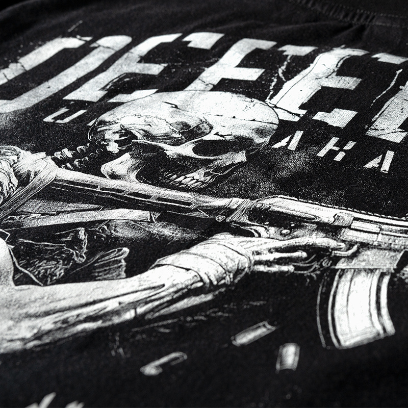 Made of high-quality cotton, ensuring comfort of wearing. On the back, a large, detailed print depicting an armed warrior with a skull, dynamically surrounded by ammunition shells. Above, the slogan "DEFENSE UNBREAKABLE". At the bottom, additional graphic elements, including bullets and text inspired by the theme of defense and values. On the front, on the left chest, a small print in the form of three bullets and a logotype.