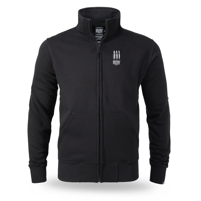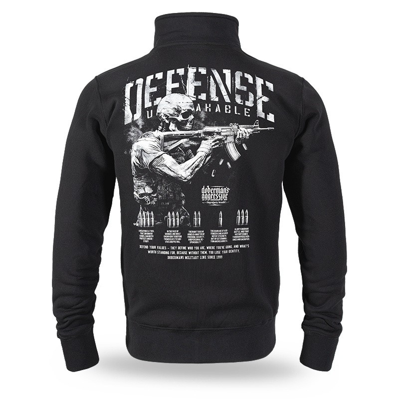 Made of high-quality cotton, ensuring comfort of wearing. On the back, a large, detailed print depicting an armed warrior with a skull, dynamically surrounded by ammunition shells. Above, the slogan "DEFENSE UNBREAKABLE". At the bottom, additional graphic elements, including bullets and text inspired by the theme of defense and values. On the front, on the left chest, a small print in the form of three bullets and a logo. A full-length zipper allows for easy putting on and taking off.