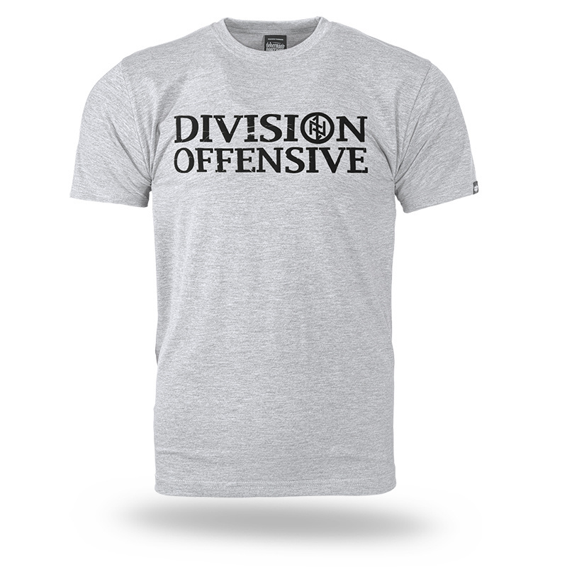 Classic men's T-shirt with short sleeves. The model is made of 100% high-quality cotton with a weight of 200g. The neckline is finished with an elastic band, a black company label on the sleeve. On the front of the T-shirt there is an inscription Offensive Division which was made using the relief printing method
