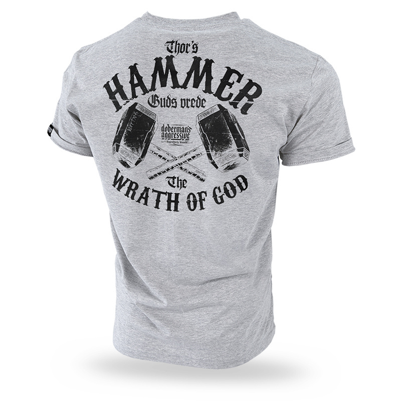 On the back of the shirt there is a print of THOR'S crossed hammers and the inscription HAMMER WRATH OF GOD and a smaller DOBERMAN'S brand logo. On the left chest there is a replication of the print on the back in a smaller format.