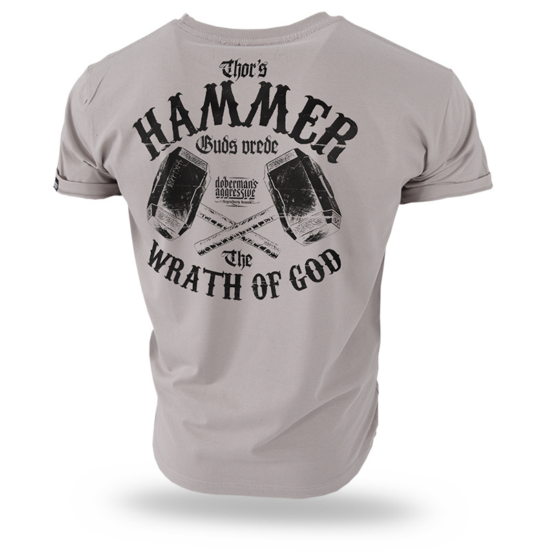 On the back of the shirt there is a print of THOR'S crossed hammers and the inscription HAMMER WRATH OF GOD and a smaller DOBERMAN'S brand logo. On the left chest there is a replication of the print on the back in a smaller format.